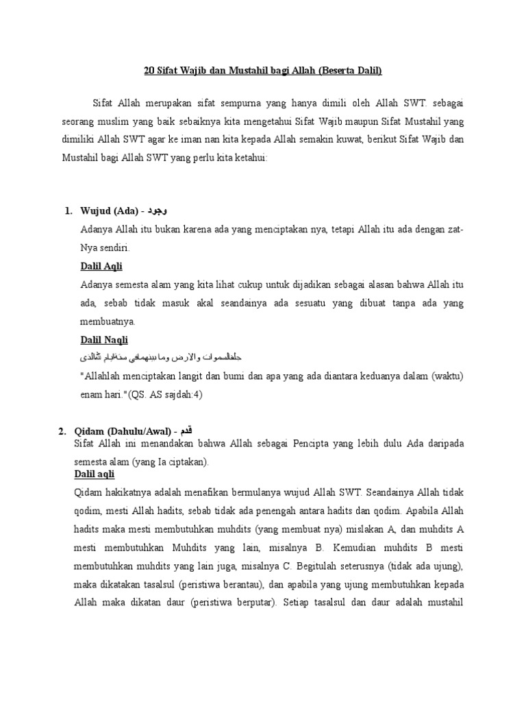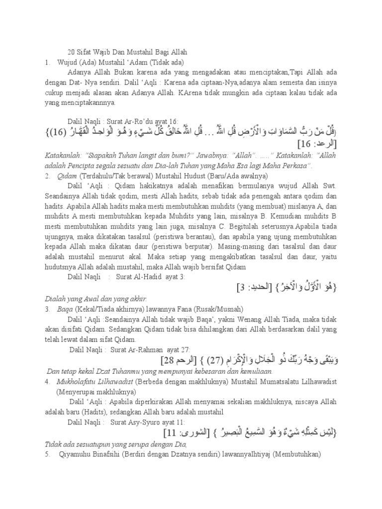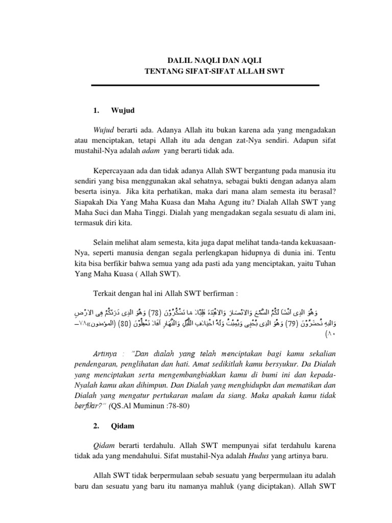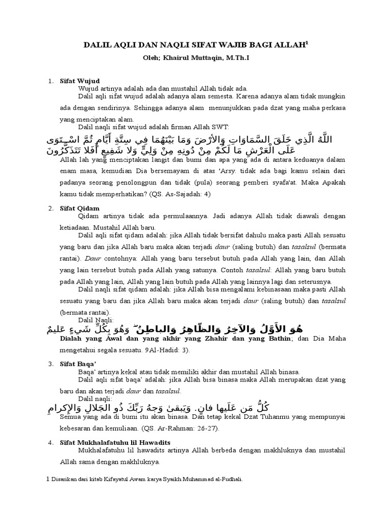 20 sifat wajib allah beserta dalil aqli dan naqli. Oleh karena itu wajib atas semua mukallaf mengenal dan mengetahui sifat yang wajib secara aqli pada. Dalil naqli sifat mukhalafah lil hawadits. Sedangkan qidam tidak bisa dihilangkan dari allah berdasarkan dalil yang ada dalam sifat qidam dahulu. Wujud ada sifat wajib allah yang pertama adalah wujud yang artinya ada.
