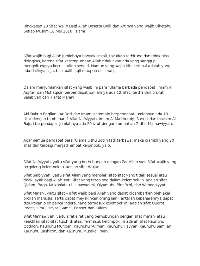 Menurut ulama sifat wajib allah ta ala sebernarnya sangatlah banyak sebab allah maha sempurna. Sifat wajib bagi allah beserta artinya dan arabnya yang telah dipaparkan di atas adalah sangat penting diketahui oleh umat islam. Seandainya allah tidak wajib baqa kekal maka tidak akan disifati qidam. Sifat allah merupakan sifat sempurna yang hanya dimiliki oleh allah swt.