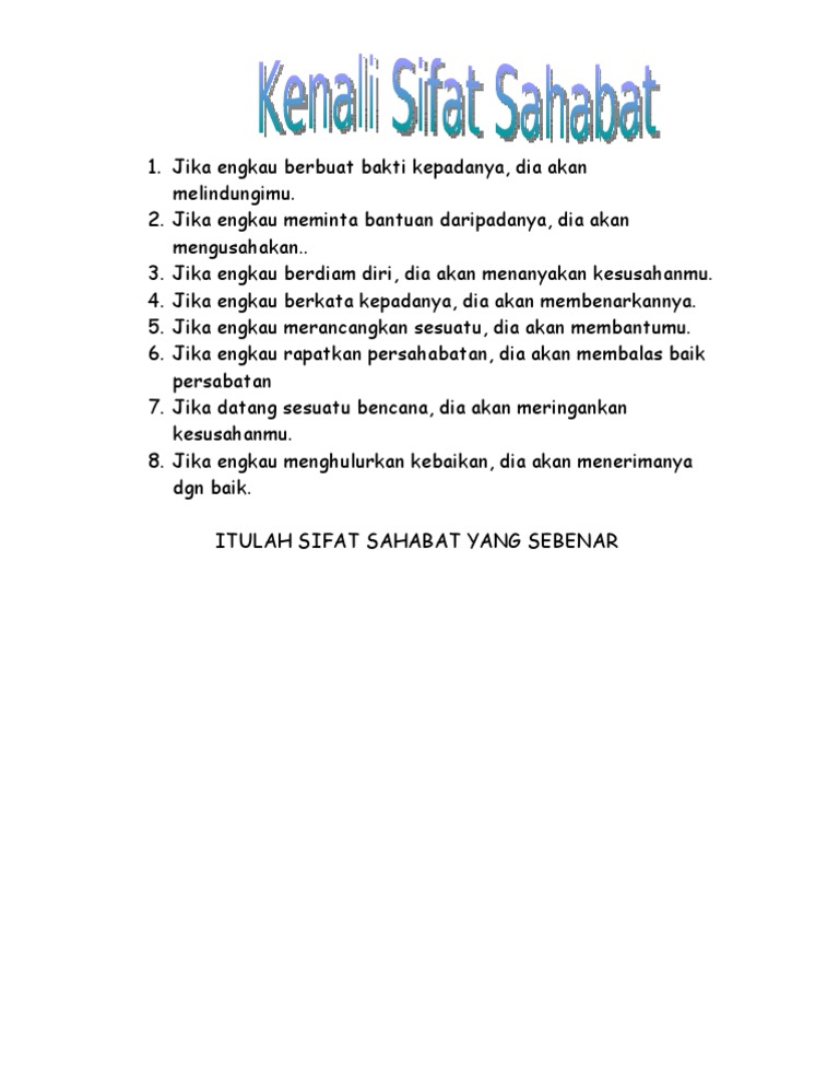 Jika kita amalkan 6 sifat ini beribu ribu sifat yang baik akan datang dalam kehidupan kita. Sahabat mempunyai berbagai sifat yang unggul abu bakar. 6 sifat sahabat bukanlah kesempurnaan agama tetapi jika kita dapat amal sifat sifat yang ada dalam diri sahabat maka mudah untuk kita mengamalkan keseluruhan agama dalam kehidupan kita. 6 sifat para sahabat allah swt meletakkan kesuksesan dan kebahagiaan hidup manusia di dunia dan akhirat hanyalah pada agama islam yang sempurna.