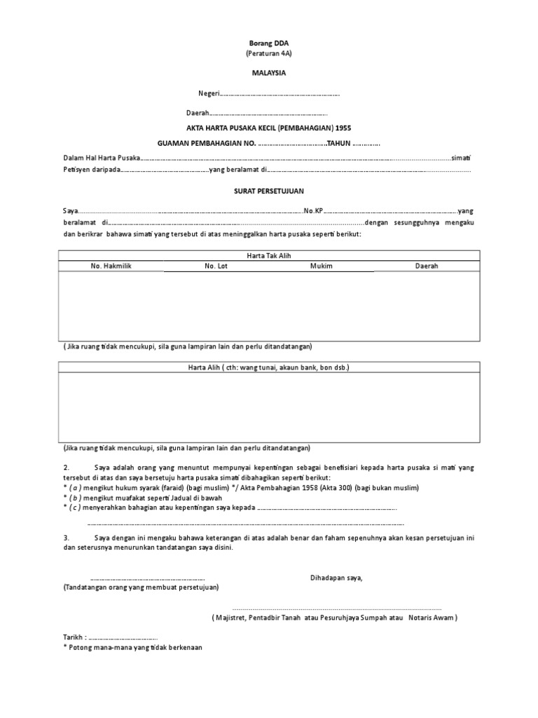 A selaras dengan undang undang islam faraid bagiorang islam akta pembahagian 1958 akta 300 bagi orang bukan islam. Saya ialah orang yang menuntut mempunyai kepentingan dalam harta pusaka tersebut sebagai benefisiari kepada harta pusaka si mati yang tersebut di atas dan bersetuju harta pusaka si mati dibahagikan seperti yang berikut. Pentadbiran harta pusaka yang kecil nilainya. Akta pembahagian harta pusaka kecil 1955 ialah satu akta yang digubal untuk memproses dan menyelesaikan harta pusaka kecil si mati.