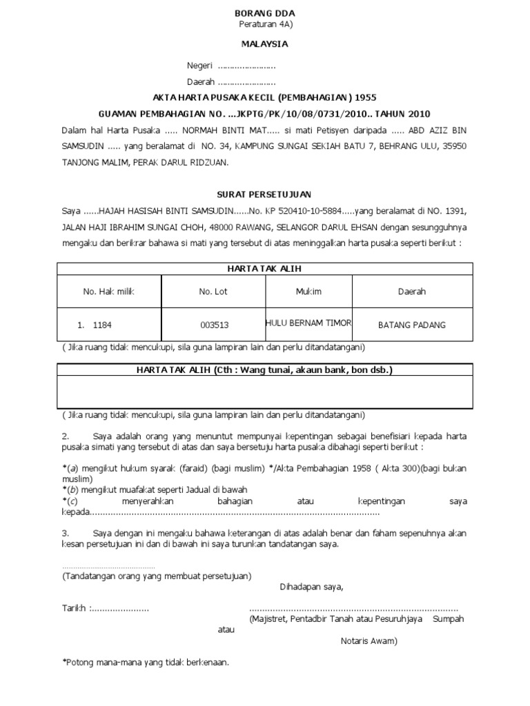 Akta harta pusaka kecil kuatkuasa akta probet dan pentadbiran harta pusaka. Saya ialah orang yang menuntut mempunyai kepentingan dalam harta pusaka tersebut sebagai benefisiari kepada harta pusaka simati yang tersebut di atas dan bersetuju harta pusaka simati dibahagikan seperti yang berikut. Borang a hendaklah dikemukakan kepada unit pembahagian pusaka kecil berserta dengan dokumen yang berikut. Penggunaan akta in telah menseragamkan pengurusan pentadbiran.