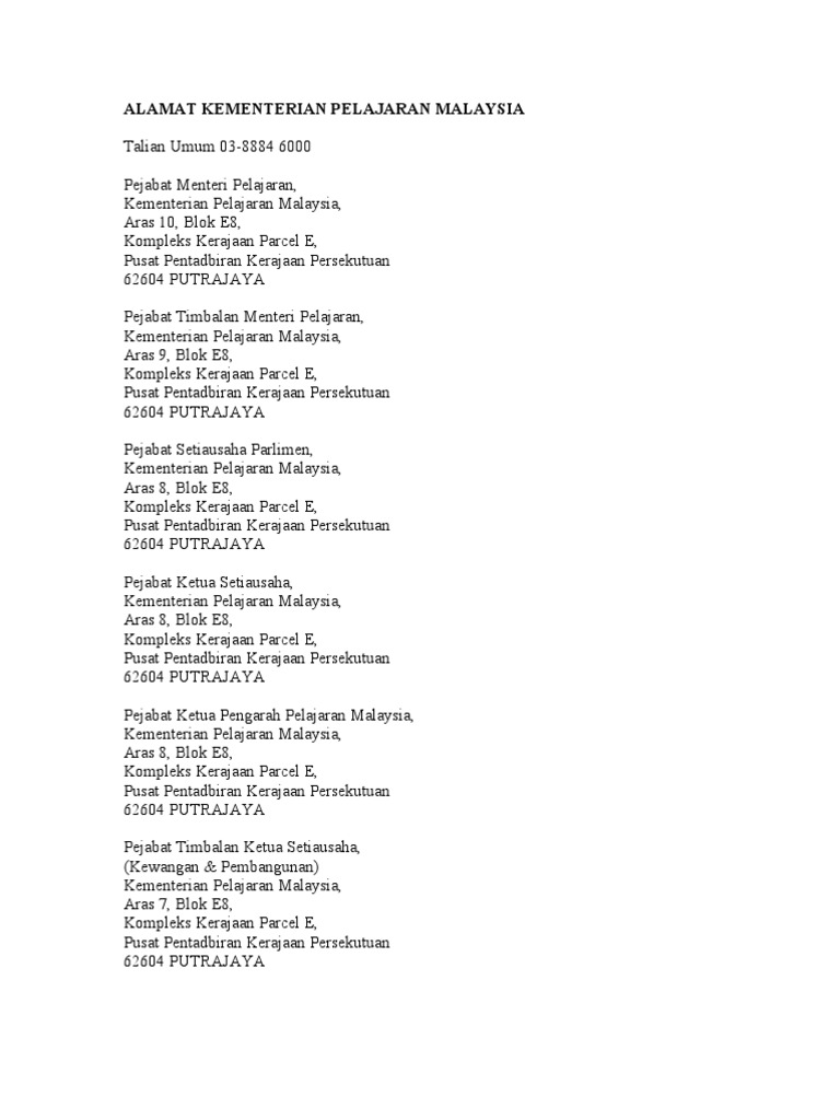 Alamat menteri pendidikan malaysia. Alamat kementerian pelajaran malaysia talian umum 03 8884 6000 pejabat menteri pelajaran kementerian pelajaran malaysia aras 10 blok e8 kompleks kerajaan parcel e pusat pentadbiran kerajaan persekutuan 62604 putrajaya pejabat timbalan menteri pelajaran kementerian pelajaran malaysia aras 9 blok e8 kompleks kerajaan parcel e. 1 jalan wisma putra presint 2 62602 putrajaya. Nama tempoh perkhidmatan 1 tun haji abdul razak bin dato haji hussein. Anda perlu hidupkan javascript untuk melihatnya.