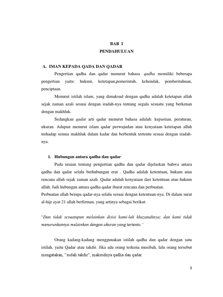 Jadi segala sesuatu yang terjadi di alam fana ini telah ditetapkan oleh allah swt. Pengertian iman kepada qada dan qadar beriman kepada qada dan qadar adalah menyakini dengan sepenuh hati adanya ketentuan allah swt yang berlaku bagi semua mahluk hidup. Perbedaan qada dan qadar perbedan qada dan qadar qada ialah kehendak allah swt dalam memenuhi suatu takdir yang ketika di tengah jalan masih bisa diubah. Dengan kata lain kelompok asyariyyah matururidiyyah dan sejumlah kelompok ulama yang lainnya berbeda pendapat perihal pengertian dari kata qadha dan qadar.