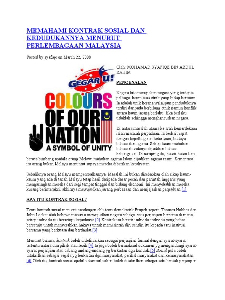 Istilah ini sebenarnya tidak wujud dalam perlembagaan persekutuan 1957 tetapi dari perspektif lain kontrak sosial sememangnya wujud dalam sejarah negara dan permuafakatan yang dicapai itulah yang mentakrifkan negara malaysia dan seterusnya menentukan sifat sesebuah. Apakah itu kontrak sosial. Orang melayu yang tinggal di kepulauan melayu iii. Kontrak sosial dalam konteks politik malaysia difahamkan sebagai pendalaman mengenai perlembagaan negara tersebut di mana dikatakan adanya satu persetujuan di kalangan pemimpin atau kumpulan elit tertentu dan merupakan secara beri gnti atau quid pro quo melalui perkara 14 1100000 yang berkenaan dengan pemberian kewarganegaraan malaysia kepada orang orang bukan melayu dan perkara 153 yang.