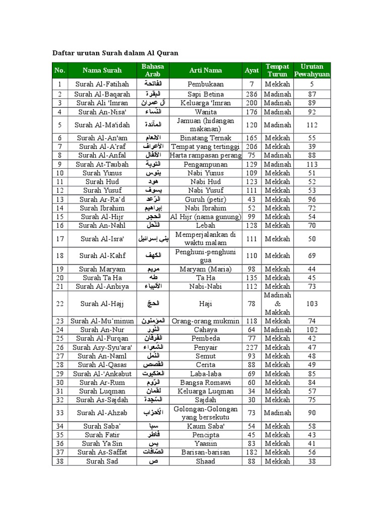 Nama surah bahasa arab arti nama ayat tempat turun urutan pewahyuan 1 surah al fatihah الفاتحة pembukaan 7 mekkah 5 2 surah al baqarah البقرة sapi betina 286 madinah 87 3 surah ali imran آل عمران keluarga imran 200 madinah 89 4 surah an nisa الن ساء wanita 176 madinah 92 5 surah al ma idah المآئدة jamuan hidangan makanan.