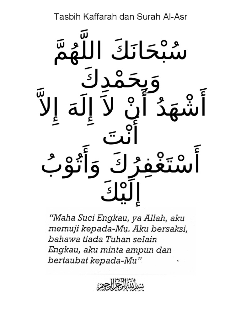 Bacaan tasbih kifarah dan surah al asr. Ungkapan tasbih kifarah yang sering di ulang sebut oleh mc atau pengerusi majlis di akhir majlis2 ilmu ialah sepatutnya tasbih kaffarah. Maksud kita membaca surah ini adalah agar kita ingat bahawa demi masa manusia itu sesungguh dalam kerugian kecuali orang yang beriman beramal solah berpesan pesan pada kebaikan dan kesabaran. Rasulullah saw telah berkata. Bacaan tasbih kafarah dalam rumi dan jawi.