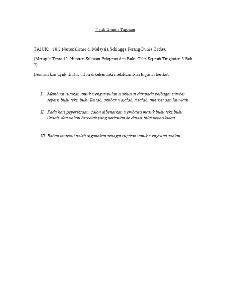 Sebulan sebelum peperiksaan tajuk tema10 bab 2 gerakan nasionalisme di malaysia sehingga perang dunia kedua pelbagai pihak te. Membuat rujukan untuk mengumpul maklumat daripada pelbagai sumber seperti buku teks buku ilmiah akhbar majalah risalah internet dan lain lain. Nasionalisme di malaysia sehingga perang dunia kedua. Tq for this essay.