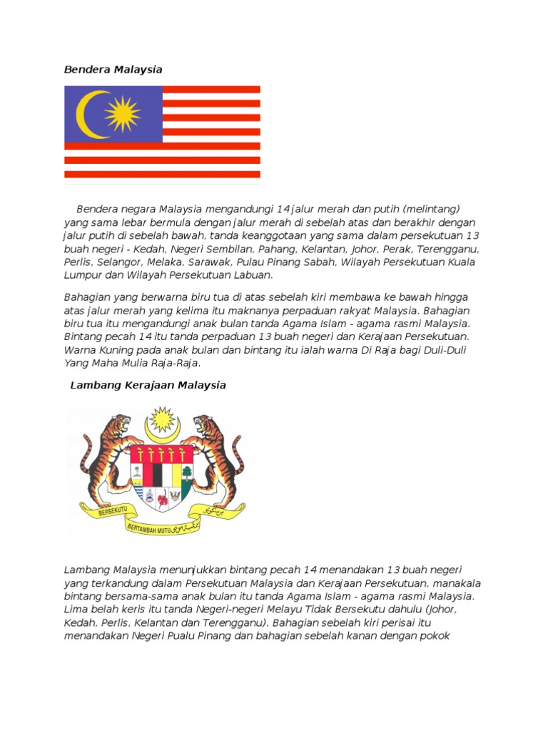 Bendera 14 negeri dalam malaysia. Bendera malaysia mengangdungi 14 jalur merah dan putih. Duli duli yang maha mulia raja raja melayu dan tuan tuan yang terutama gabenor gabenor dalam satu persidangan majlis raja raja menjelang pembentukan malaysia telah memperkenankan iaitu reka bentuk bendera malaysia hendaklah mengikut reka bentuk bendera persekutuan tanah melayu dengan pengubahsuaian pada bilangan jalur jalur dan bintang pecah 14 bagi menandakan 14 buah negeri bagi persekutuan. Jalur merah dan putih ini membawa maksud 13 buah negeri di malaysia dan sebuah kerajaan persekutuan. Ada juga negeri negeri di malaysia yang tidak mempunyai sultan.