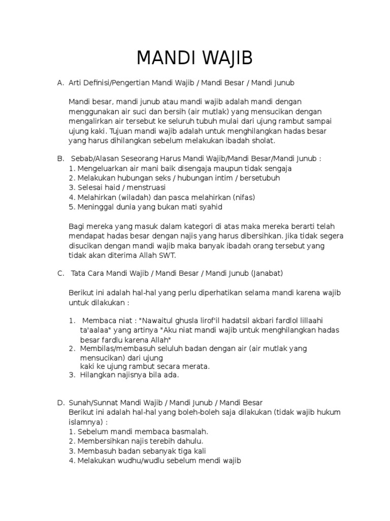Mandi wajib atau mandi junub ialah menyucikan keseluruhan badan dengan air bersih. Apa itu mandi wajib dan bila perlu dilakukan. بسم الله والحمد لله والصلاة والسلام على رسول الله وعلى آله وصحبه ومن والاه أما بعد.