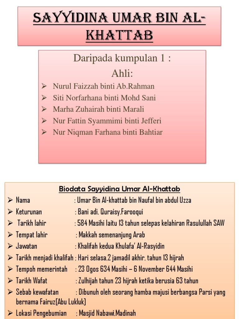 Khalifah umar adalah merupakan khalifah yang banyak melakukan pembaharuan kepada negara islam. 581 november 644 kadang kadang dipanggil juga sebagai umar al farooq ataupun omar atau umar ialah daripada bani adi iaitu salah satu golongan bani adi quraisy. 581 november 644 kadang kadang dipanggil juga sebagai umar al farooq ataupun omar atau umar ialah daripada bani adi iaitu salah satu golongan puak bani adi quraisy. Biodata saidina umar bin al khattab nama penuh.
