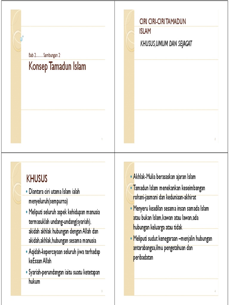 Ciri khusus tamadun islam. 1 9 ciri ciri khusus tamadun islam ciri ciri umum tamadun islam pada dasarnya mempunyai persamaan dengan ciri ciri tamadun barat sebagaimana yang telah diperkatakan sebelum ini. Matlamat khusus tamadun islam adalah untuk menjalinkan hubungan manusia dengan allah pencipta alam. Tamadun islam mengimbangi antara kehidupan di dunia dan di akhirat. Penggunaan tulisan adalah salah satu ciri penting tamadun islam ia mempercepatkan proses penyebaran kebudayaan islam seterusnya mempergiatkan perkembangan ilmu yang memberi kesan yang mendalamterhadap perubahan dalam semua aspek kehidupan umat.
