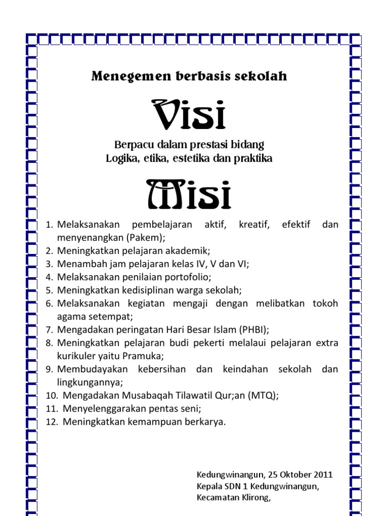 Visi ini menjiwai warga sekolah kami untuk selalu mewujudkannya setiap saat dan berkelanjutan dalam mencapai tujuan sekolah. Di bawah ini adalah beberapa contoh visi dan misi sekolah yang dapat menginspirasi anda. Meningkatkan kemampuan warga sekolah dalam iptek dan berbahasa inggris. Visi smp negeri 8 cilacap beriman berbudi luhur berprestasi dan berjiwa mandiri kami memilih visi ini untuk tujuan jangka panjang jangka menengah dan jangka pendek.