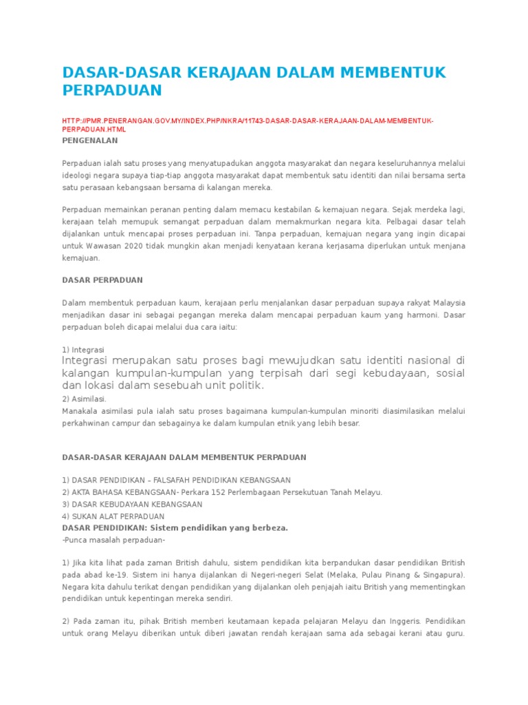 4 kurikulum sekolah rendah dan menengah diberi tumpuan dalam aspek pembinaan negara bangsa dan sejarah negara budaya dan adat resam kaum2 di malaysia agama dan kepercayaan utama negara. Dalam tempoh enam dekad iaitu dari tahun 1954 hingga 2014 negara brunei darussalam sudah mengadakan sebanyak lima kategori dasar pendidikan. Dasar pendidikan yang digubal memberi tumpuan kepada pelbagai aspek dan komponen dalam system pendidikan iaitu meliputi peringkat pendidikan formal penis pendidikan kurikulum pentadbiran penyertaan dan agihan. Dasar dasar kerajaan dalam membentuk perpaduan 1 dasar pendidikan 2 dasar kebudayaan kebangsaan 3 dasar ekonomi baru 4 dasar pembangunan nasional 5 dasar wawasan negara 6 dasar sosial negara dasar pendidikan dasar pendidikan kerajaan yang mentadbir penting dalam membentuk perpaduan kaum di negara kita.