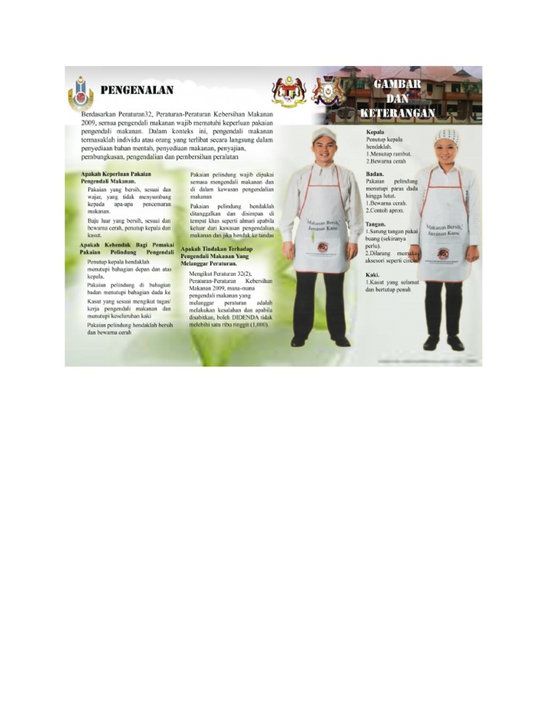 Etika pakaian pengendali makanan. Semua pengendali makanan samada terlibat secara langsung atau tidak perlu menghadiri kursus pengendalian makanan ini. Menjadi lebih peka terhadap kebersihan diri peralatan yang digunakan dan keadaan premis. Pengendalian makanan perkakas dsb. Buku panduan ini mengandungi maklumat asas yang para pengendali makanan perlu ketahui untuk mengendali menyedia menyimpan dan memasak makanan dengan betul dan bersih untuk dijual kepada orang ramai.