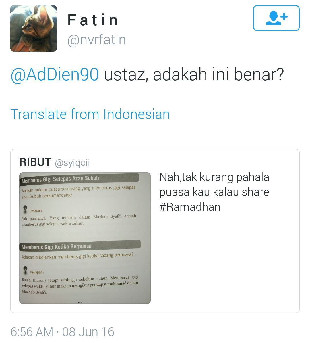 Jadi bila kita ingin melakukannya diperbolehkan dengan catatan harus menyikat dengan pelan pelan agar air dan pasta gigi tidak ikut masuk dalam mulut. Gosok gigi dianjurkan dalam setiap keadaan baik ketika puasa maupun di luar puasa baik di pagi hari maupun siang hari. Imam nawawi rahimahullah berkata jika seseorang bersiwak dengan siwak yang basah lantas cairan dari siwak tadi terpisah lalu tertelan atau ada serpihan dari siwak yang ikut tertelan puasanya batal.