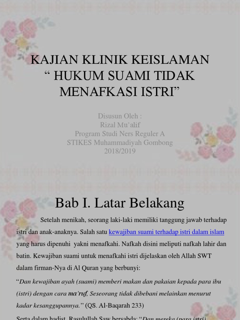 Republika co id saya seorang ibu rumah tangga berusia 39 tahun suami berusia 35 tahun. Kami sdh tdk tnggal serumah hampir 1 tahun. Dan kewajiban ayah suami memberi makan dan pakaian kepada para ibu istri dengan cara ma ruf seseorang tidak dibebani melainkan menurut kadar kesanggupannya qs. Jika suami tidak memberikan nafkah lahir dan batin atau tidak mau menggauli istrinya karena malas itu adalah suatu kedzaliman dan dosa.