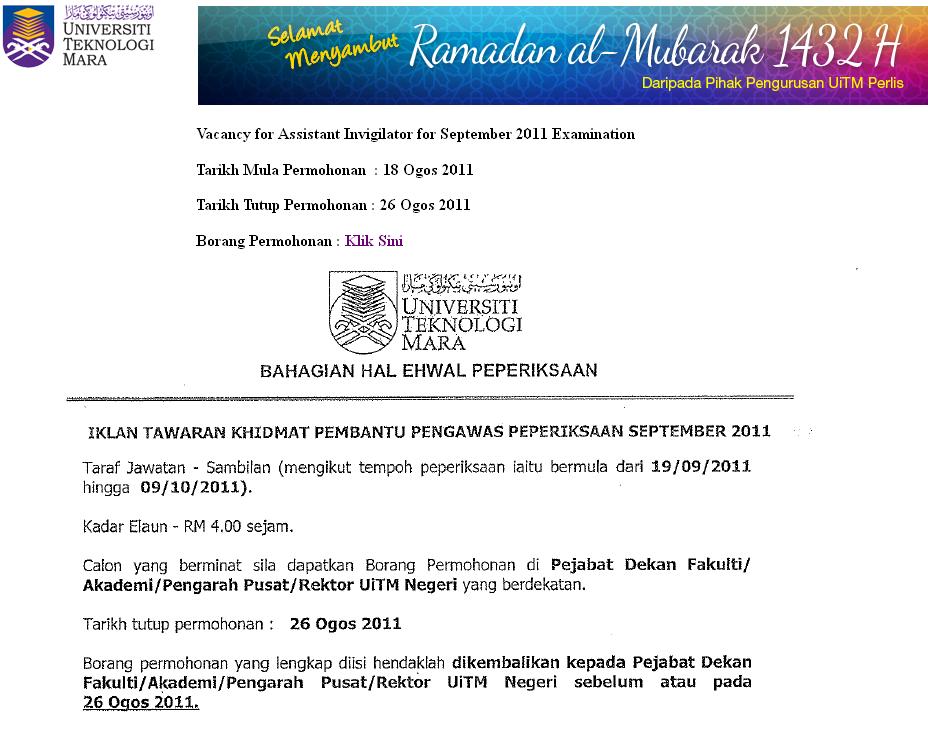 Juruteknik landskap n17 4. Sistem epengambilan staf universiti teknologi mara. 4 iklan kekosongan jawatan akademik uitm cawangan perlis sila klik. Sekiranya anda seorang warganegara malaysia yang cukup syarat kelayakan dan berumur tidak kurang daripada 18 tahun pada tarikh tutup iklan jawatan adalah dipelawa untuk memohon bagi mengisi kekosongan jawatan tetap atau kontrak yang diiklankan.