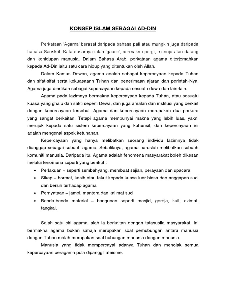 Konsep islam sebagai al din hasil pembelajaran di akhir sesi pengajaran dan pembelajaran pelatih seharusnya dapat. Menjelaskan keperluan manusia kepada agama. 3 ad din adalah sistem yang lengkap. Islam sebagai ad din bermaksud cara hidup yang merangkumi segenap aspek kehidupan manusia sama ada dari aspek politik ekonomi dan sosial.