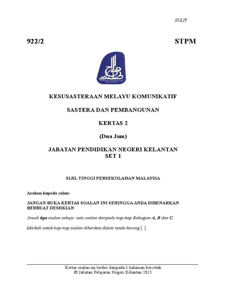 Kami warga jabatan pendidikan negeri kelantan dengan penuh tekad dan iltizam berikrar dan berjanji akan menumpukan seluruh tenaga dan usaha kami agar. Calon wajib menduduki semua kertas peperiksaan bagi mata pelajaran yang didaftar calon yang tidak dapat menduduki mana mana kertas peperiksaan bertulis atau melaksanakan ujian lisan khusus calon persendirian akan dianggap tidak hadir bagi mata pelajaran berkenaan. Bahasa melayu bm sejarah matematik bahasa inggeris sejarah kertas 3 kimia matematik tambahan biologi prinsip perakaunan sains. Guru pembina negara bangsa.