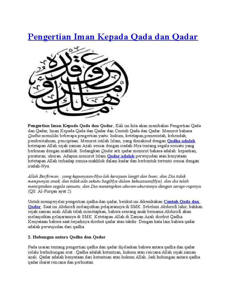 Maka akal itu menurut pengertian yang sebenarnya akan melindungi pemiliknya dari yang membahayakan dan membawanya kepada yang bermanfaat dan. Pengertian iman kepada qada dan qadar beriman kepada qada dan qadar adalah menyakini dengan sepenuh hati adanya ketentuan allah swt yang berlaku bagi semua mahluk hidup. Menurut ahlussunnah wal jamaah qadha dan qadar mempunyai empat tingkatan. Oleh karena itu qadha dapat diartikan sebagai keputusan.