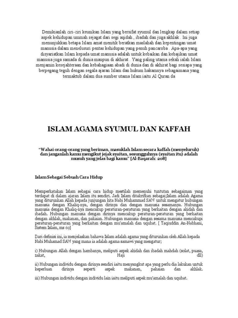 205 secara garis besar allah telah memberikan beberapa petunjuk tentang bermuamalah yang baik yang sesuai dengan al akhlaq al karimah akhlak yang mulia antara lain ialah. Hukum islam bersifat fleksibel iaitu berubah ubah mengikut keadaan. 36 sampai dengan ayat 39 dan pada surat al baqarah 2. Syumul menyeluruh syumul bermaksud islam merupakan agama yang sempurna dan menyeluruh serta mencakupi segala aspek kehidupan setiap manusia.