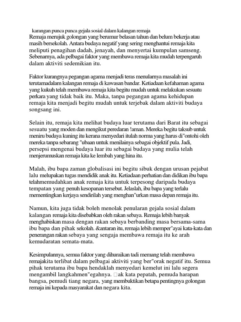 Karangan punca gejala sosial dalam kalangan remaja. Terdapat banyak faktor yang menyebabkan berlakunya masalah sosial dalam kalangan remaja ini. Antara budaya negatif yang sering menghantui remaja kita meliputi penagihan dadah jenayah dan menyertai kumpulan samseng. Karangan masalah sosial dalam kalangan remaja punca kesan dan langkah langkah masalah sosial dalam kalangan remaja merupakan fenomena yang semakin membimbangkan kita pada hari ini. Sebenarnya ada pelbagai faktor yang membawa remaja kita mudah terpengaruh dalam aktiviti sedemikian itu.