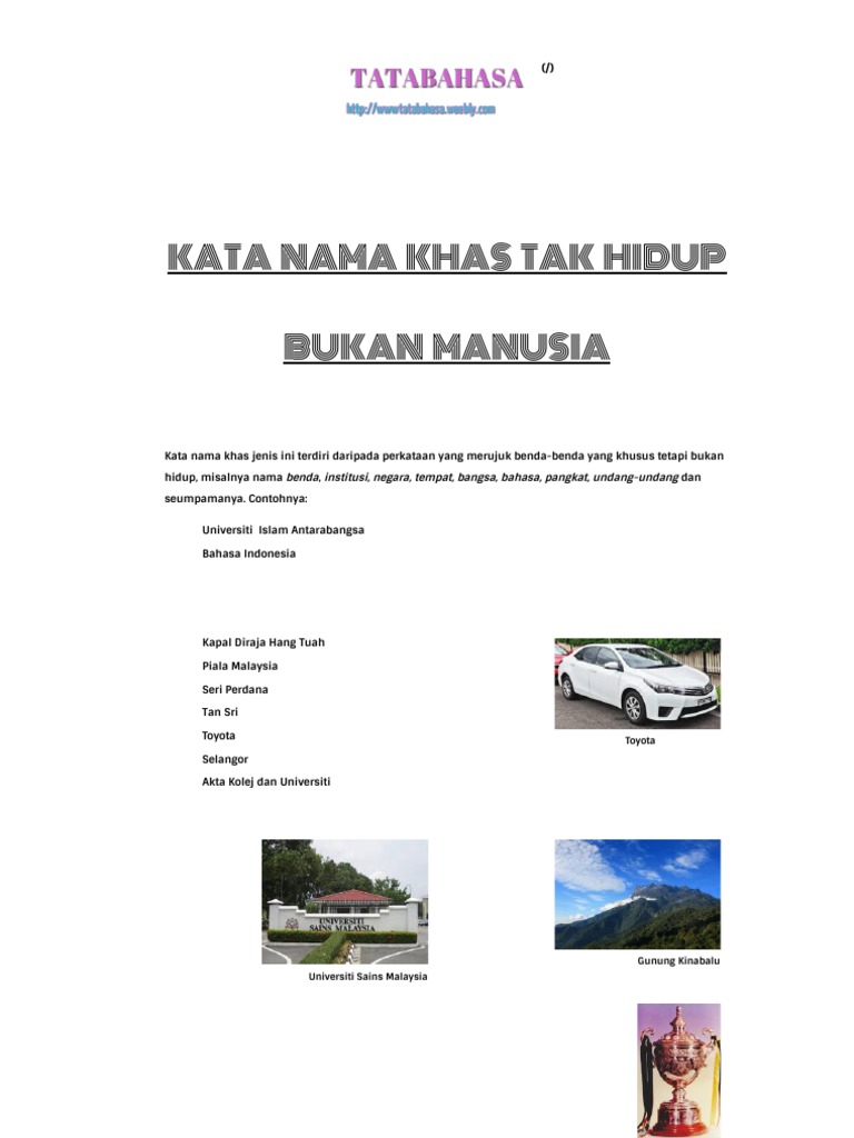 Kata nama khas 1. Kata nama khas jenis ini terdiri daripada perkataan yang merujuk benda benda yang khusus tetapi bukan hidup misalnya nama benda institusi negara tempat bangsa bahasa pangkat undang undang dan seumpamanya. Kata nama khas tak hidup 3. Kata nama khas hidup b.