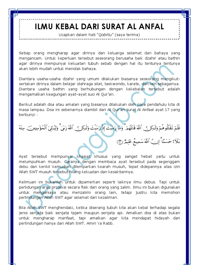 Khasiat dari surat al anfal ayat 17 untuk kekebalan setiap orang mengharap agar dirinya keluarganya selamat dari bahya yang mengancam. Seperti yang telah disebut ada tujuh sebab semuanya. Melemparkan segenggam batu batu kecil hingga menyebabkan banyak yang mati di kalangan musuh. Baca juga surat al waqiah.