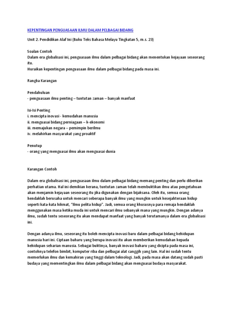 Lebih separuh abad kita menghela nafas kemerdekaan namun remaja yang merupakan bakal tunjang negara masih terbelenggu oleh pelbagai kemelut sosial. Karangan kepentingan menguasai ilmu dalam era globalisasi penguasaan ilmu dalam pelbagai bidang memang penting dan perlu diberikan perhatian utama. Sebagai seorang remaja anda juga merupakan seorang belia yang mempunyai peranan penting dalam membangunkan dan memajukan negara ini. Hal ini dikatakan demikian kerana tuntutan zaman telah membuktikan bahawa ilmu atau pengetahuan akan menjamin kejayaan seseorang itu jika digunakan dengan bijaksana.