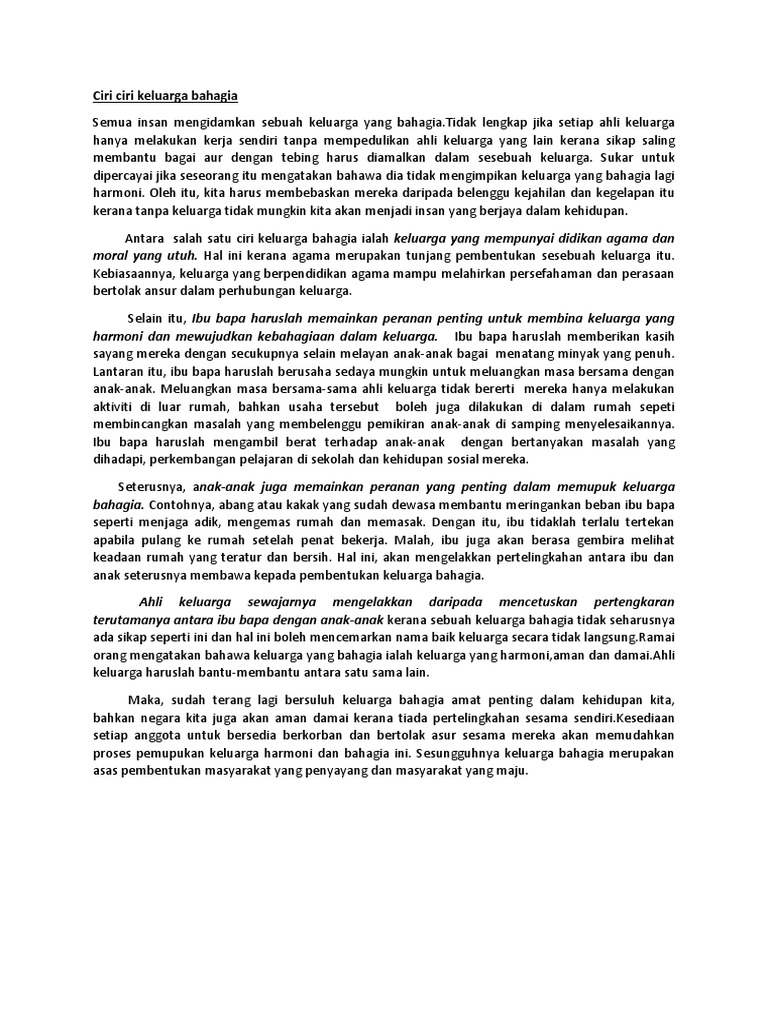 Contoh karangan bahasa melayu bm kertas 1 spm keluarga bahagia masyarakat sejahtera sijil pelajaran malaysia. Di samping itu kepentingan memilik keluarga bahagia ialah dapat membentuk sikap sikap positif dalam kalangan ahli keluarga. Ada juga keluarga yang mempunyai bilangan orang tua yang lebih banyak seperti datuk nenek dan pak cik serta mak cik pula. Keluarga bahagia ialah sebuah keluarga yang mampu menyelesaikan masalah keluarga dengan berbincang atau menyelesaikannya dengan cara yang baik.