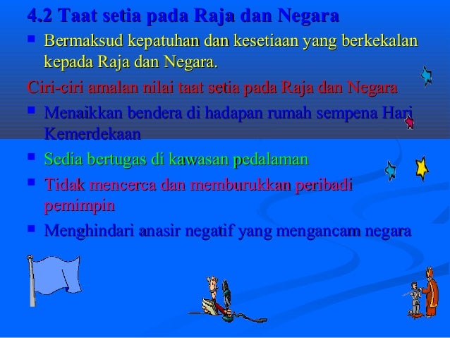 Adalah menjadi kewajipan selaku rakyat di negara brunei darussalam untuk menumpukan taat setia yang tidak berbelah bahagi kehadapan majlis kebawah duli yang maha mulia paduka seri baginda sultan dan yang di pertuan negara brunei darussalam sebagaimana dituntut oleh agama islam. Kesetiaan kepada raja dan negara bermaksud bahawa setiap warganegara hendaklah menumpukan sepenuh taat setia jujur dan ikhlas kepada seri paduka baginda yang di pertuan agong. Kita tidak perlu menentang pemerintah sekiranya kita dapat melaksanakan perintah allah dengan aman dan tenteram. 6 1 5 kepentingan taat setia kepada raja prinsip kedua rukun negara ialah kesetiaan kepada raja dan negara.