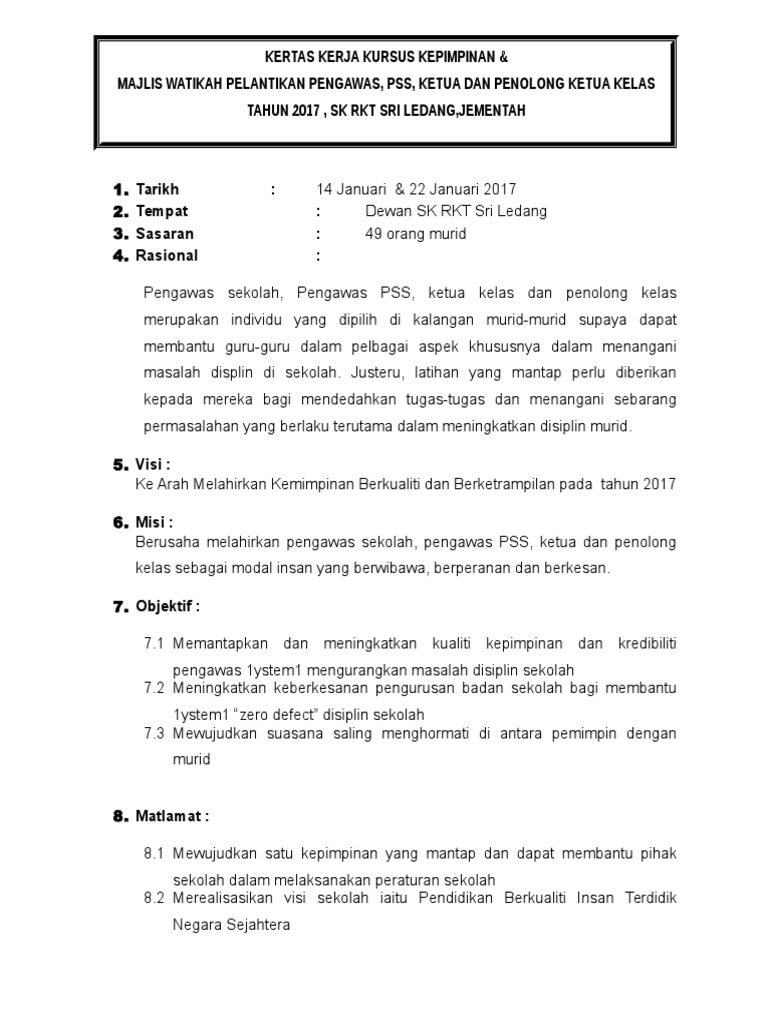 Kertas kerja penganjurankursus asas kepimpinan dan pengurusan organisasiperingkat felda bukit rokan utarapenganjur bersama. Kursus kepimpinan pengawas 2013 sekolah kebangsaan wira kuantan 2 5 0 tentatif program tarikh. Pengurusan felda bukit rokan utaramaklumat kursus tentatif. Kertas kerja kursus pengurusan kepimpinan kokurikulum smk tun mutahir melaka 2011 1.