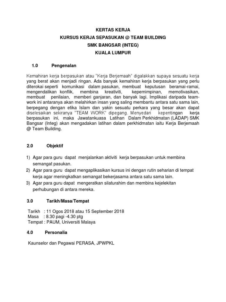 Kursus team building ini bermatlamat untuk menggalakkan penyertaan semua pelajar di dalam membina semangat. Google facebook twitter newer post older post search here. Kem baha gua musang kelantan tema. Related posts to contoh kertas kerja untuk team building contoh kertas kerja untuk team building 2017 12 30t13 08 00 08 00 rating.