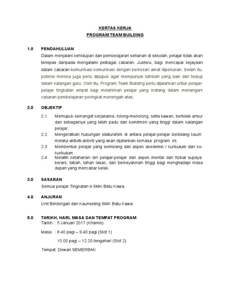 Kertas kerja team building. 5 20 orang. 27 hingga 28 februari 2019 rabu hingga khamis masa. Pengurusan pegawai tidak hadir bertugas. Dalam masa yang sama mereka juga mungkin akan mengubah.