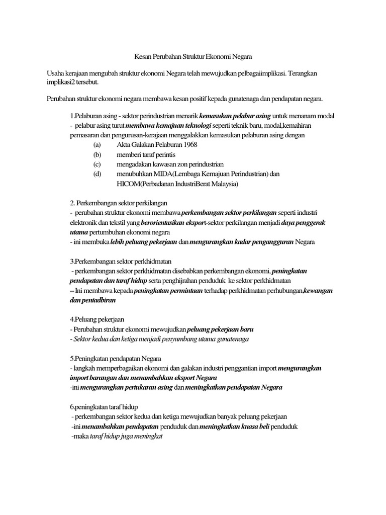 Sebaliknya pertumbuhan ekonomi yang stagnan hampir bisa dipastikan berujung pada peningkatan angka kemiskinan. Namun demikian pembangunan ekonomi yang pesat dan taraf hidup rakyat yang semakin meningkat turut mengundang pelbagai impak sosial seperti peminggiran pengangguran peningkatan kadar jenayah masalah dan gejala sosial kehilangan mata pencarian dan masalah penempatan. Masalah ekonomi yang akan timbul seperti peningkatan jumlah pengangguran lapangan kerja yang dikuasai tenaga kerja asing produktivitas kerja yang buruk dan sebagainya. Langkah mempelbagaikan ekonomi langkah kerajaan menjalankan dasar mempelbagaikan ekonomi mendorong perubahan struktur ekonomi.