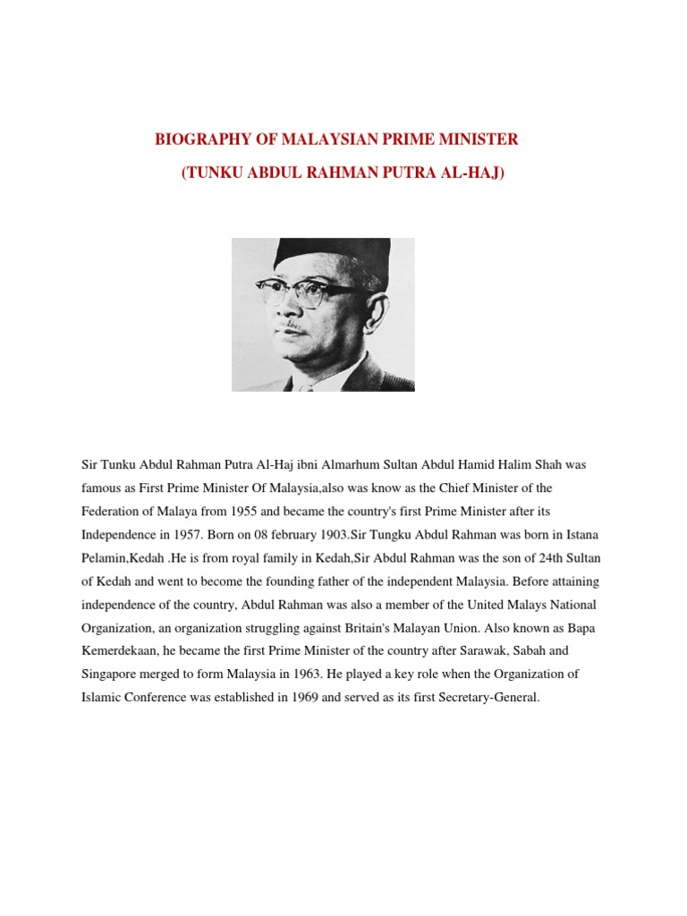 Tunku abdul rahman putra al haj latar belakang sumbangan politik 1 penentangan terhadap malayan union 2 menerajui kepimpinan umno 3 perjuangan kemerdekaan 4 menangani ancaman komunis 5 pembentukan gagasan persekutuan malaysia 6 kegiatan islam 7 dasar luar tunku ekonomi sosial 4. Istana tiga tingkat alorsetar beliau belajar di sekolah melayu dan sekolah inggeris kerajaan kolej sultan abdul halim. Tunku abdul rahman putra al haj sebagai tokoh yang menjadi kajian dalam. تونكو عبدالرحمن ڤوترا الحاج ابن المرحوم سلطان عبدالحميد حاليم شاه dmn dk duk ac ch 8 february 1903 6 december 1990 was a malaysian statesman who served as the head of government of malaysia and its predecessor states from 1955 to 1970.