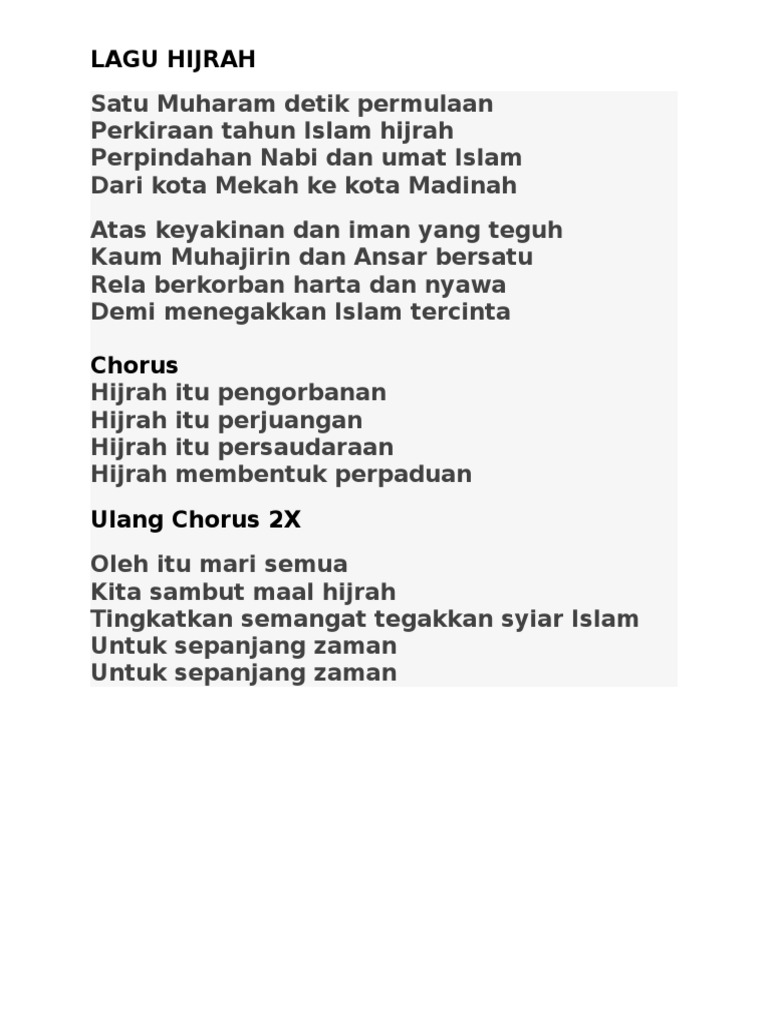 Lirik lagu nasyid maal hijrah. Atas keyakinan dan iman yang teguh kaum muhajirin dan ansar bersatu rela berkorban harta dan nyawa demi menegakkan islam tercinta. Oleh itu mari semua kita sambut maal hijrah tingkatkan semangat tegakkan syiar islam untuk sepanjang zaman. Koleksi pantun dan ucapan maal hijrah awal muharam 1442h 2020m. Lirik lagu indonesia terlengkap disertai dengan video deskripsi artis dan download mp3 nya.