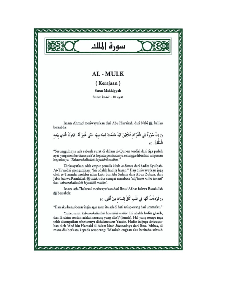 Maksud surah al mulk. Surah ini tergolong surah makkiyah yang terdiri daripada 30 ayat. Diposting oleh aurellia dintani 8 21 2012. Terjemahan al quran bahasa melayu. Al mulk merupakan salah satu jenis surah yang tergolong dalam golongan surat makkiyah diturunkan sebelum rasullulah shallalahu alaihi wa sallam hijrah ke madinah.
