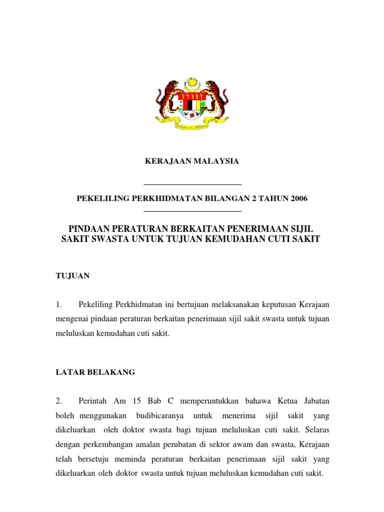 Pekeliling di atas bertujuan melaksanakan keputusan kerajaan mengenai pindaan peraturan berkaitan penerimaan sijil sakit swasta untuk tujuan meluluskan kemudahan cuti sakit. Bagi pegawai perkhidmatan awam persekutuan. Tarikh 1 januari 2018 pegawai boleh menggunakan kadar tambahan baharu ini mulai 1 januari 2018. Pekeliling perkhidmatan ini bertujuan melaksanakan keputusan kerajaan bagi menambah baik kadar kelayakan kemudahan cuti rehat tahunan bagi pegawai perkhidmatan awam persekutuan.