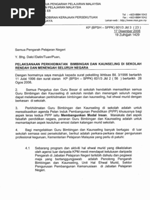 Pekeliling waktu bekerja guru bimbingan dan kaunseling. Keselamatan diri pelajar semasa pembelajaran pendidikan jasmani dan kesihatan serta kegiatan kokurikulum dan sukan di dalam dan di luar kawasan sekolah. Paparan ini juga turut menyediakan piagam misi prinsip dan hal hal berkaitan dengan unit bimbingan kaunseling. Jika dilihat pada jadual ringkasan waktu mengajar guru mengikut pekeliling yang dinyatakan. Senarai surat pekeliling kementerian pelajaran malaysia dan undang undang peraturan untuk perkhidmatan bimbingan dan kaunseling.