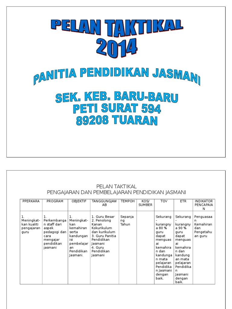 Pelan taktikal dan operasi pendidikan jasmani. 2016 2018 pelan operasi pelan strategik panitia pj pelan. Pelan taktikal panitia pendidikan jasmani pendidikan kesihatan matlamat. Pelan taktikal panitia pendidikan jasmani 2014. Kurikulum pendidikan jasmani dan kesihatannama program ceramah motivasi dan pameran kesihatanobjektif menyemai kesedaran tentang isi isu berkaitan dengan kesihatan diri dan persekitarantempoh mac julaikumpulan sasaran murid tahap 1 dan pelajar tahun 4 5guru terlibat ketua panitia dan guru mata pelajaranproses kerja 1 perlantikan jawatan kuasa dalaam.