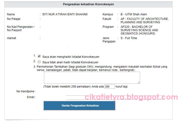 Pengesahan kehadiran kovokesyen bila dah dekat bulan konvo kajian pengesanan graduan dan daftar pengambilan borang jubah. No kad pengenalan no pasport. Konvokesyen uitm kali ke 85 akan berlangsung pada bulan oktober 2016 aku merupakan salah seorang yang akan terlibat di dalam sidang konvokesyen tersebut. Tanpa sila masukkan no pelajar dan no kad pengenalan anda untuk membuat pengesahan.