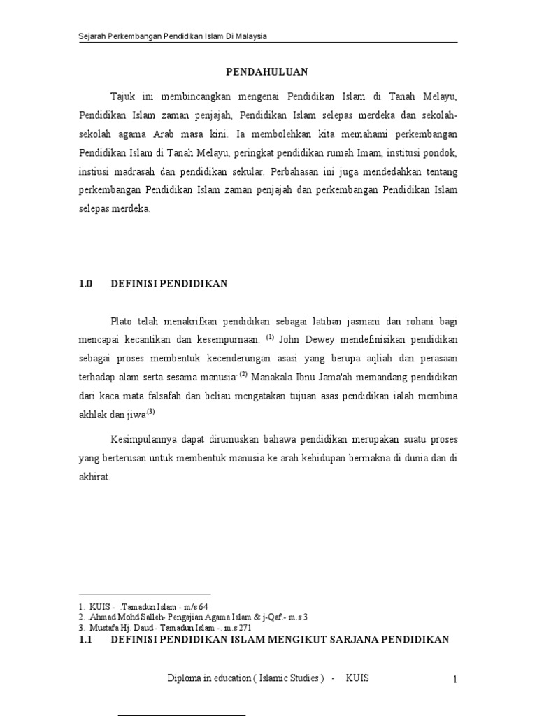 Kedinamikan pendidikan islam yang berakar umbi dari sejarah johor ini kini diteruskan dengan langkah yang lebih pantas dan tersusun serta alternatif yang lebih pelbagai pada masa kini. Perkembangan pendidikan islam di malaysia hingga kini zaman kerajaan melayu melaka kedatangan islam ke alam melayu berlaku di sekitar tahun 630 masehi iaitu di zaman hayat rasulullah saw atau dipertengahan abad ke 7 masehi yang dibawa oleh saudagar saudagar arab dengan alasan bahawa hubungan perdagangan antara saudagar saudagar arab dengan nusantara telah pun berlaku sebelum daripada itu. Latar belakang pendidikan islam di indonesia makalah konsep komponen tujuan islam adalah agama dakwah artinya agama yang selalu mendorong pemeluknya untuk senantiasa aktif melakukan kegiatan dakwah. Awang sariyan penyandang kursi pengajian melayu malaysia china beijing foreign studies university kertas kerja yang disampaikan dalam forum perdana islam dan cabaran masa kini bersempena dengan ihya ramadhan unimap 2009 universiti malaysia perlis pada 25 ogos.