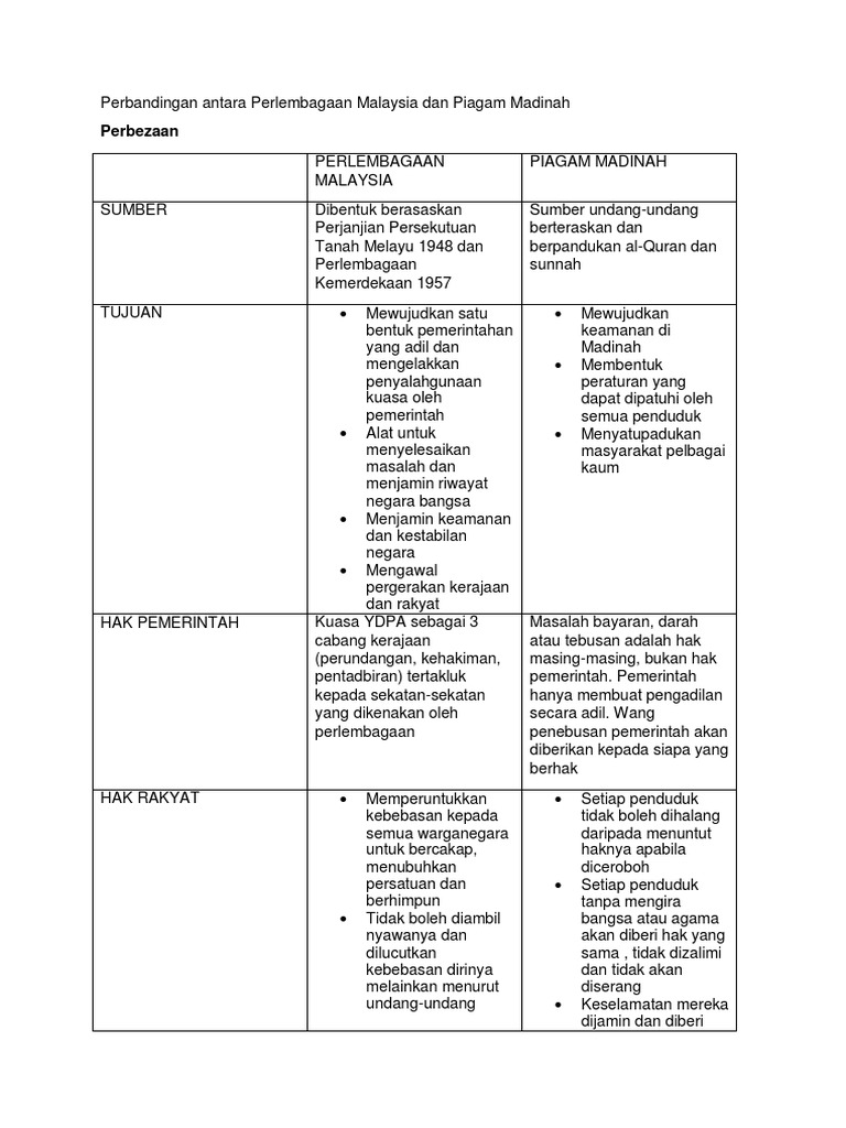 Piagam madinah dan perlembagaan malaysia. 23 fasal piagam tersebut membicarakan tentang hubungan antara umat islam sesama umat islam iaitu antara ansar dan muhajirin. Pertama sekali anda harus mengetahui definisi piagam madinah dan perlembagaan malaysia. Persamaan dan perbezaan antara piagam madinah dan perlembagaan malaysia. Fasal 25 kebebasan penduduk madinah mengamalkan gama masing masing.