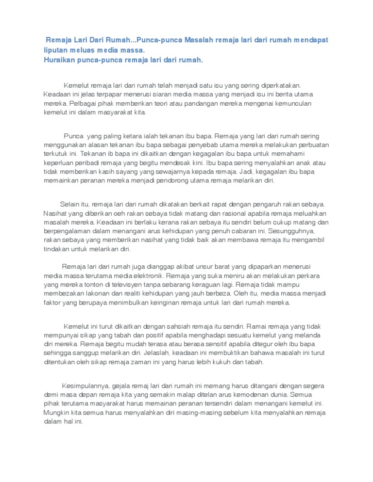 Punca remaja lari dari rumah. Jenis punca kesan langkah mengatasi statistik dan teori teori psikologi sosiologi yang berkaitan dengan masalah remaja lari dari rumah 1 0 pengenalan golongan belia sememangnya tidak dapat lari daripada terdedah kepada masalah masalah sosial yang berlaku dalam suasana di persekitaraan pada hari ini. Apa yang akak tulis tu itulah yang saya rasa skarang. Kemelut remaja lari dari rumah telah menjadi satu isu yang sering diperkatakan. Tekanan ib bapa ini dikaitkan dengan kegagalan ibu bapa untuk memahami keperluan peribadi remaja yang begitu mendesak kini.
