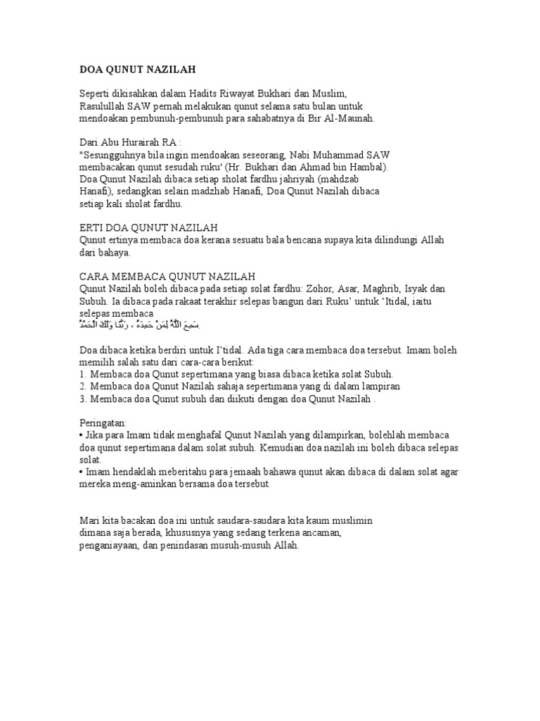 Solat subuh tanpa doa qunut. Sebaiknya doa qunut digunakan atau dilakukan pada saat terdapat musibah atau bencana. Mengikut mazhab maliki dan syafie membaca doa qunut ketika solat subuh adalah sunat muakkad sunat yang dituntut dan digalakkan. Namun untuk bacaan qunut dalam tata cara sholat subuh ini pun ada perbedaan pendapat. Tribunpontianak co id hukum membaca doa qunut dalam sholat subuh berdasarkan penjelasan ustaz abdul somad yang dihimpun dari 4 mashab.