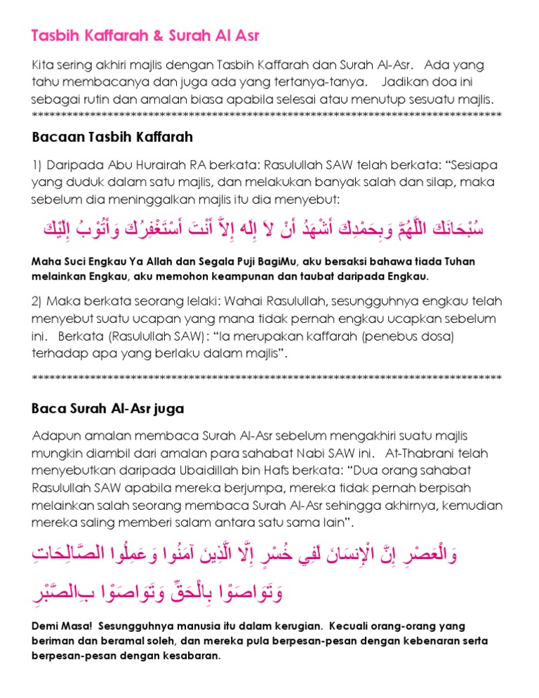 Sesudah itu kita sambung dengan bacaan surah al asr. Help us caption translate this video. Nabi sallahu alaihi wasallam jika bertemu tidak akan berpisah kecuali salah seorang daripada mereka akan membaca surah al asr kemudian bersalaman antara satu sama lain. Ungkapan tasbih kifarah yang sering di ulang sebut oleh mc atau pengerusi majlis di akhir majlis2 ilmu ialah sepatutnya tasbih kaffarah.