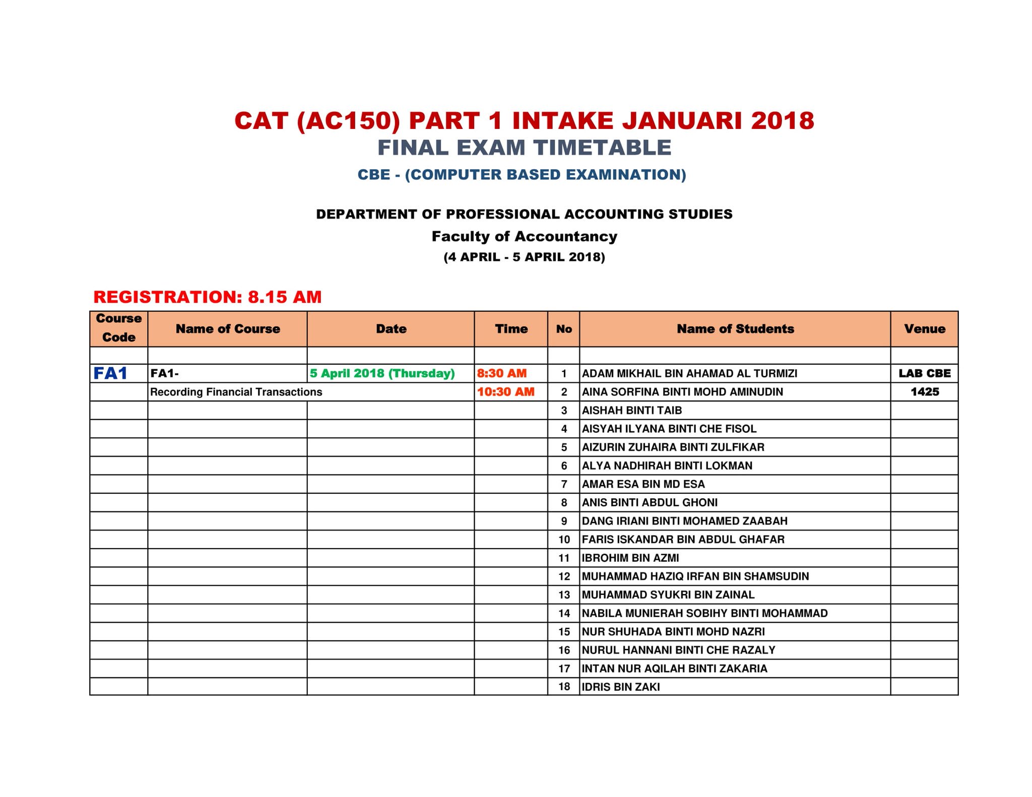 If you have a saturday final exam according to the official final examination schedule academic resources will compile a comprehensive list of classes and submit the list to upd to ensure that the building and room is open. Final examination schedule fall 2019 academic calendar. Generate final exam timetable auto fetch from i learn select faculty campus from list below. 30 august 2018 appeal for review of final examination assessment result 17 30 august 2018 application deadline for special leave 3 december 2018 final exam.