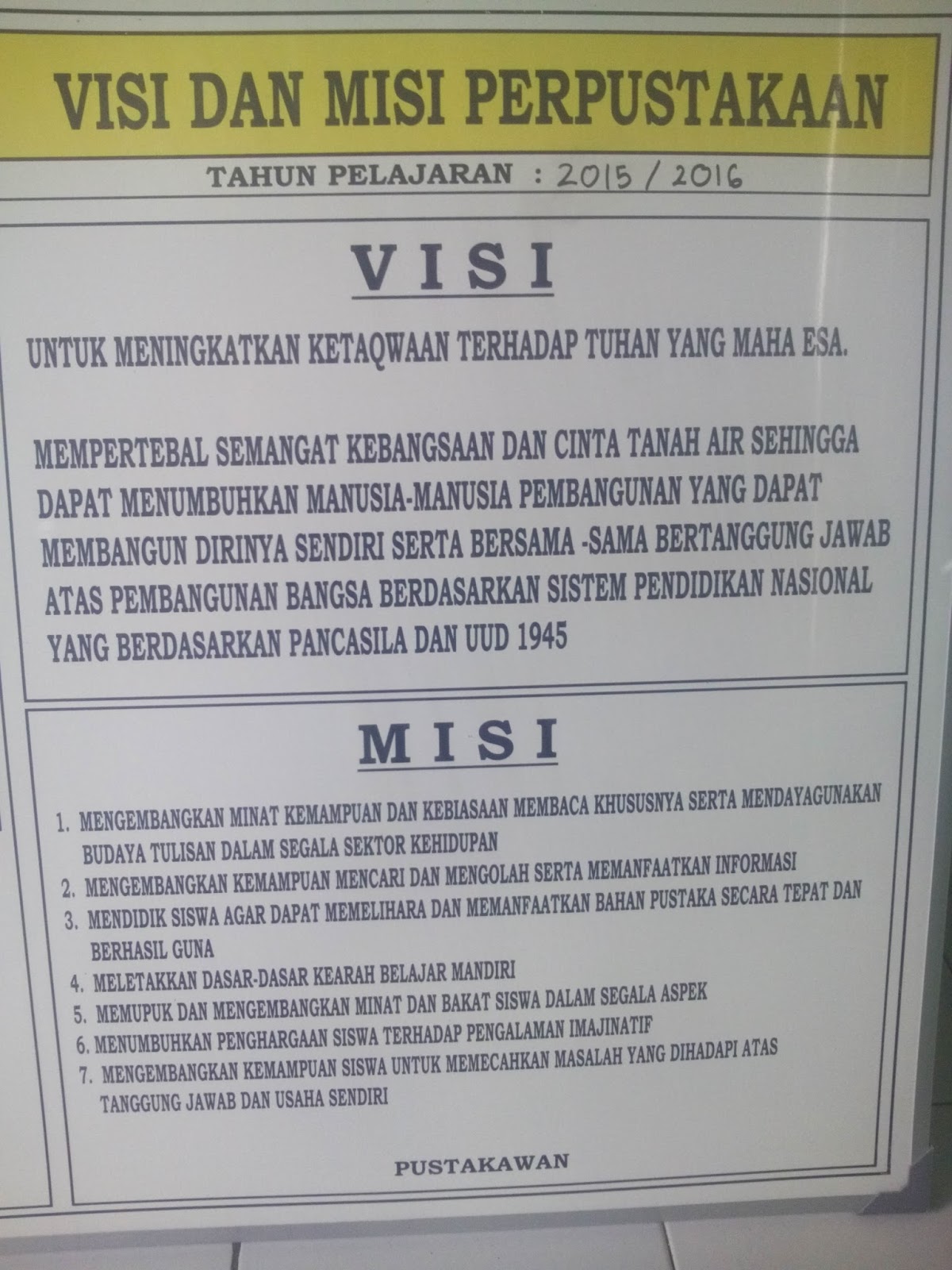 Visi dan misi perpustakaan sekolah. Menjadikan perpustakaan sebagai jantungnya pendidikan di sekolah. Visi menjadikan perpustakaan sebagai pusat informasi dan jantungnya sekolah dan menjalin hubungan yang erat antar pengguna dengan pengelola perpustakaan misi 1. Menjadikan perpustakaan sebagai tempat memperoleh pengetahuan informasi dan rekreasi. Visi program studi perpusinfo menjadi program studi pelopor dan unggul pada bidang perpustakaan dan informasi yang berkarakter pendidikan di indonesia tahun 2020.